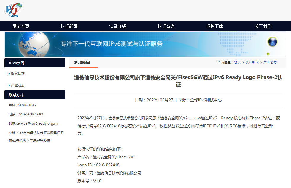 近期,888集团安全网关 FisecSGW在下一代互联网国家工程中心-全球IPv6测试中心正式顺利获得IPv6 Ready核心协议Phase-2测试,并荣获由国际组织IPv6 Forum颁发的IPv6 Ready Logo Phase-2认证证书(Logo ID:02-C-002418)。