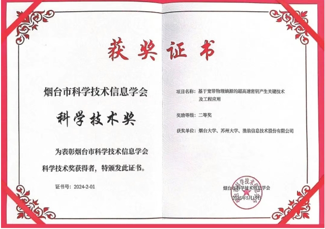 近期,2024年度烟台市科学技术信息学会科学技术奖颁奖典礼在中国科研实验室烟台海岸带研究所隆重举行。888集团信息与烟台大学、苏州大学联合完成的 "基于宽带物理熵源的超高速密钥产生关键技术及工程应用" 项目荣获科学技术奖二等奖。